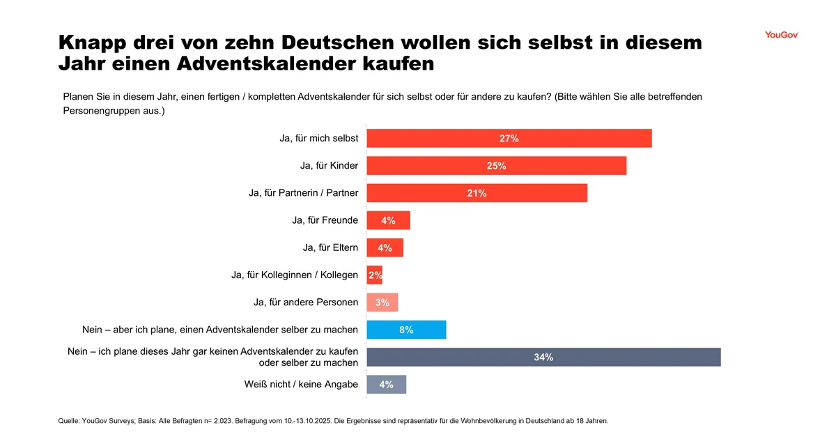 Insgesamt planen 27 Prozent aller Befragten in diesem Jahr, einen Kalender für sich selbst zu kaufen. Rund ein Viertel (25 Prozent) möchte einen Adventskalender für Kinder erwerben, nur etwas weniger planen einen für den Partner oder die Partnerin (21 Prozent). 42 Prozent geben an, in diesem Jahr ganz auf den Kauf eines Kalenders zu verzichten. Dies ergab eine Umfrage mit YouGov Surveys.