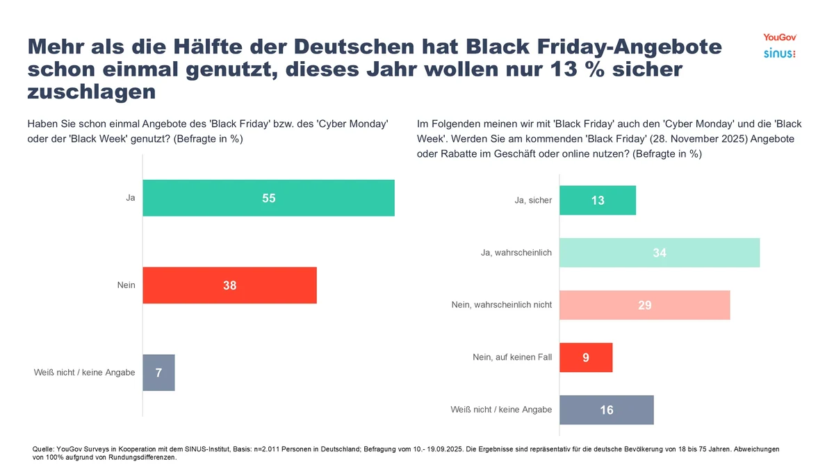 - 55 Prozent haben Black Friday-Angebote schon mal genutzt, dieses Jahr wollen nur 13 Prozent sicher zuschlagen