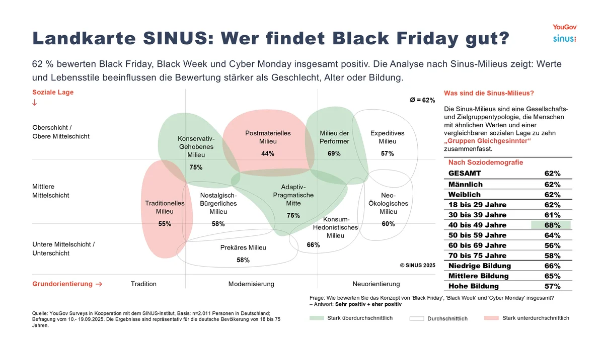 62 Prozent bewerten das Konzept von Black Friday, Black Week und Cyber Monday grundsätzlich positiv, 23 Prozent sehen die Rabattjagd kritisch. Eine Analyse nach dem Gesellschaftsmodell der Sinus-Milieus, welches die deutsche Bevölkerung auf Basis ihrer Werte, Lebensstile und der sozialen Lage in zehn „Gruppen Gleichgesinnter“ einteilt, zeigt: Werthaltungen prägen das Konsumverhalten maßgeblich. Jan Hecht, Director Research & Consulting bei SINUS, erläutert: „Besonders offen ist die Adaptiv-Pragmatische Mitte – der moderne Mainstream unserer Gesellschaft sieht vor allem die Ersparnis für das Familienbudget. Auch die Konservativ-Gehobenen stehen dem Konzept überraschend aufgeschlossen gegenüber: In ihrer schwindenden Führungsrolle will das klassische Establishment mit der Zeit gehen. Am skeptischsten blicken die konsumkritischen und nachhaltigkeitsaffinen Postmateriellen auf das Rabattphänomen.“