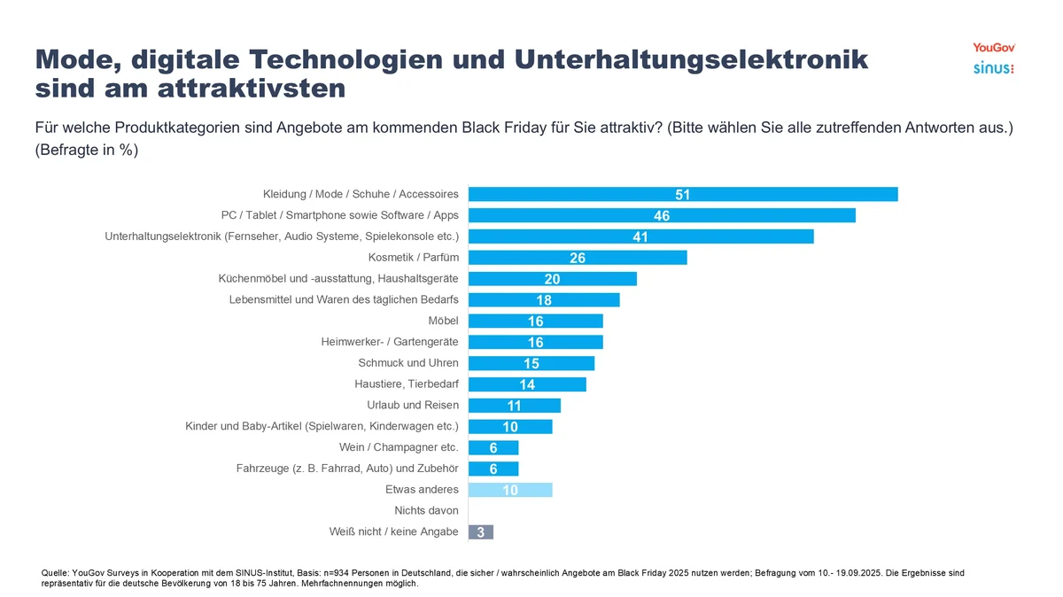 Wenn am 28. November 2025 wieder geklickt, gekauft und gespart wird, stehen bei den Black Friday-Shoppern vor allem Mode (51 Prozent), PC & Smartphones (46 Prozent) sowie Unterhaltungselektronik (z.B. Fernseher, Audio, Spielekonsolen) (41 Prozent) im Fokus. Die Motive sind vielfältig: 45 Prozent aller Befragten berichten, bereits gute Schnäppchen gemacht und spürbar gespart zu haben – ähnlich viele (43 Prozent) widersprechen dem. Gleichzeitig erkennen 64 Prozent aller Befragten in den Angeboten oft „Scheinrabatte“ - und haben das Gefühl, dass echte Preisvorteile selten sind.