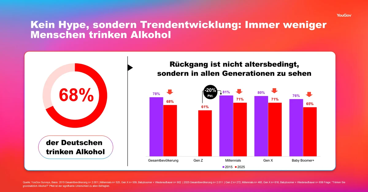 Weitere YouGov-Daten zeigen einen langfristigen Trend: Insgesamt trinken immer weniger Menschen in Deutschland Alkohol. Im Jahr 2025 gaben 68 Prozent der Verbraucher an, Alkohol zu konsumieren. Zehn Jahre zuvor, im Jahr 2015, lag dieser Anteil noch bei 78 Prozent.