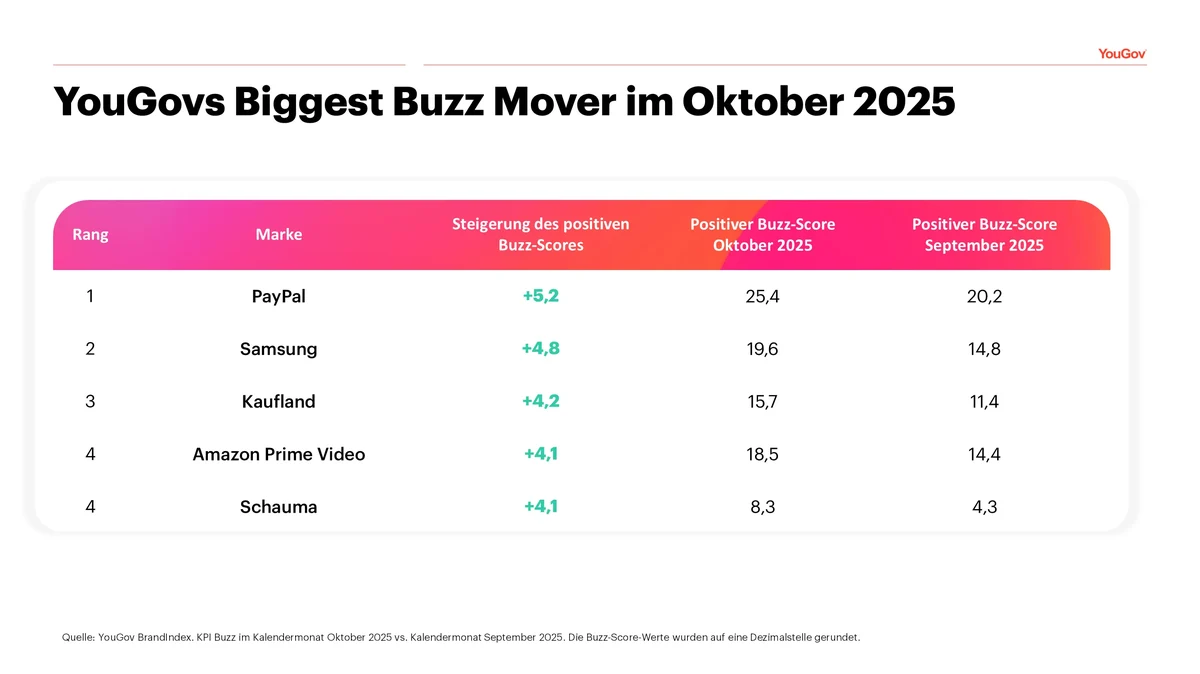 YouGovs Biggest Buzz Mover in diesem Monat ist PayPal. Der US-amerikanische Online-Bezahldienst erreichte im Kalendermonat Oktober 2025 die höchste Steigerung des positiven Buzz-Scores unter mehr als 1.500 im YouGov BrandIndex getrackten Marken. Die Steigerung betrug 5,2 Scorepunkte: Der positive Buzz-Score von PayPal lag im Oktober unter allen deutschen Verbrauchern bei 25,4 Scorepunkten, im Vormonat September 2025 bei 20,2 Punkten.