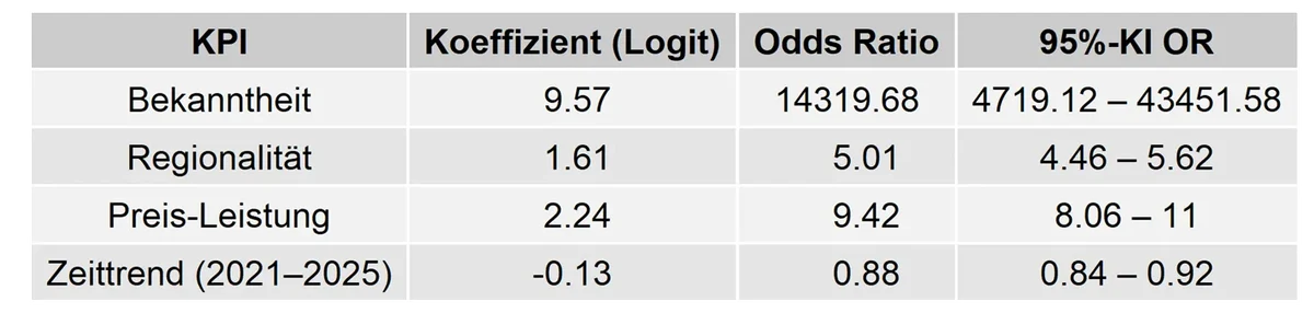 Die drei Wahrnehmungsdimensionen – Bekanntheit, Regionalität und Preis-Leistung – bilden eine wichtige mentale Grundlage für das Entscheidungsverhalten der Bevölkerung, auch wenn daneben natürlich weitere Faktoren eine Rolle spielen. Dass sie sich unterschiedlich stark bewegen, aber langfristig stabil strukturiert bleiben, ist ein wichtiges Ergebnis. Es zeigt, welche Faktoren sich über Kommunikation beeinflussen lassen und welche stärker von historischen oder geografischen Gegebenheiten abhängen.