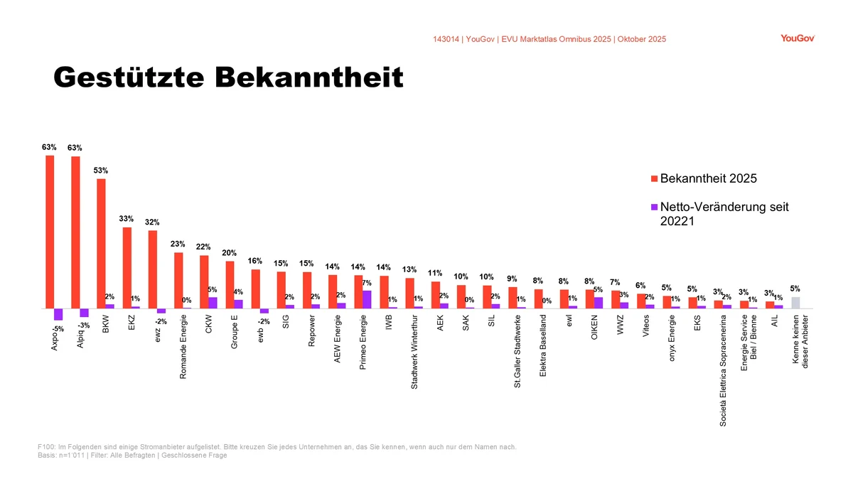 Gleichzeitig zeigt die Studie, dass Kommunikationsmassnahmen, Investitionen in Präsenz oder geografische Expansion durchaus wirksam sind. Anbieter wie CKW, Groupe E oder Primeo Energie konnten ihre Bekanntheit im Zeitverlauf messbar steigern. Dieses Muster verdeutlicht, dass Bekanntheit trotz ihrer Stabilität ein beeinflussbarer Faktor bleibt – allerdings mit hohem Ressourceneinsatz und eher langfristiger Wirkung.