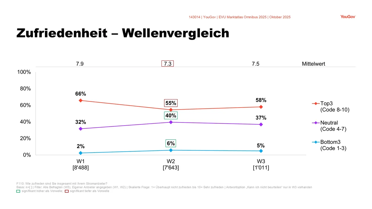 Neben den markenspezifischen Wahrnehmungen liefert die Studie von YouGov Schweiz wichtige Erkenntnisse über die Stimmung in der Bevölkerung. Die Zufriedenheit mit dem eigenen EVU wurde auf einer Skala von 1 bis 10 erhoben. Die Werte zeigen eine klare, aber moderate Verschiebung: 2021 lag der Durchschnitt noch bei 7.9, sank im Zuge der Energiepreiskrise auf 7.3 und stieg 2025 leicht auf 7.5. Auch wenn diese Werte nicht auf eine fundamentale Krise hindeuten, zeigen sie doch, dass das Vertrauen in die Branche nicht völlig resistent gegenüber externen Schocks ist.