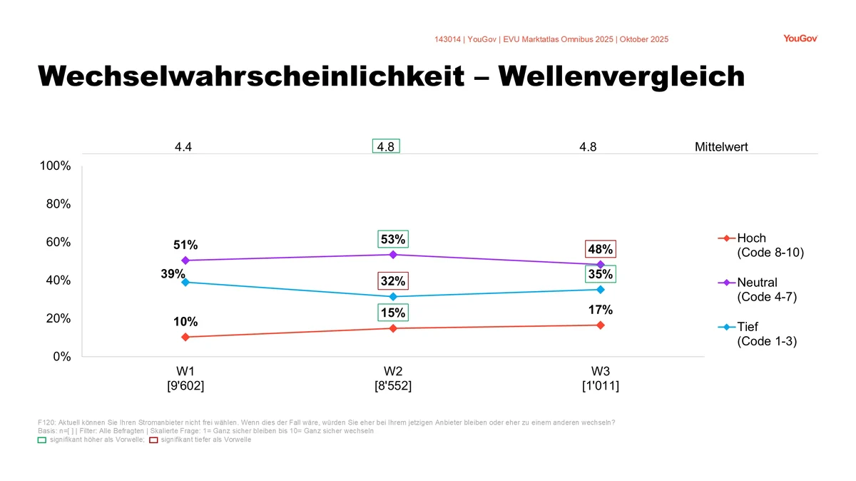 Noch aufschlussreicher ist die hypothetische Wechselbereitschaft. Obwohl Privatkundinnen und Kunden ihren Anbieter nicht frei wählen können, steigt die Bereitschaft in einem hypothetischen Szenario kontinuierlich: 2021 wären rund 10 Prozent sicher gewechselt, 2023 bereits 15 Prozent, und 2025 mit 17 Prozent nochmals leicht mehr. Das entspricht heute jeder sechsten Person. Knapp die Hälfte ist unentschlossen, während ein Drittel ein niedriges Wechselrisiko aufweist.