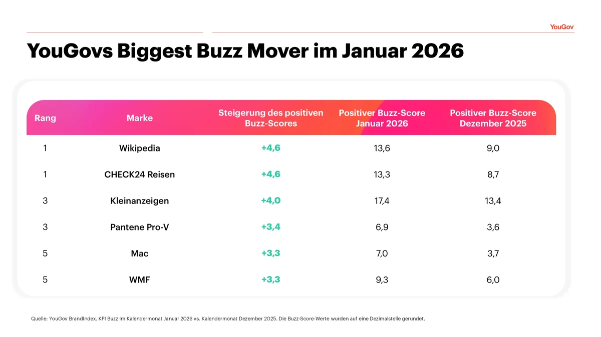 YouGovs aktuelle Biggest Buzz Mover sind Wikipedia und CHECK24 Reisen. Die freie Online-Enzyklopädie und das Reise-Vergleichsportal erreichten beide im Kalendermonat Januar 2026 die höchste Steigerung des positiven Buzz-Scores unter mehr als 1.500 im YouGov BrandIndex getrackten Marken. Die Steigerung betrug jeweils +4,6: Der positive Buzz-Score von Wikipedia lag im Januar unter allen deutschen Verbrauchern bei 13,6, im Vormonat Dezember 2025 bei 9,0 Punkten. Bei CHECK24 Reisen lag der Wert im Januar bei 13,3 und im Vormonat bei 8,7.