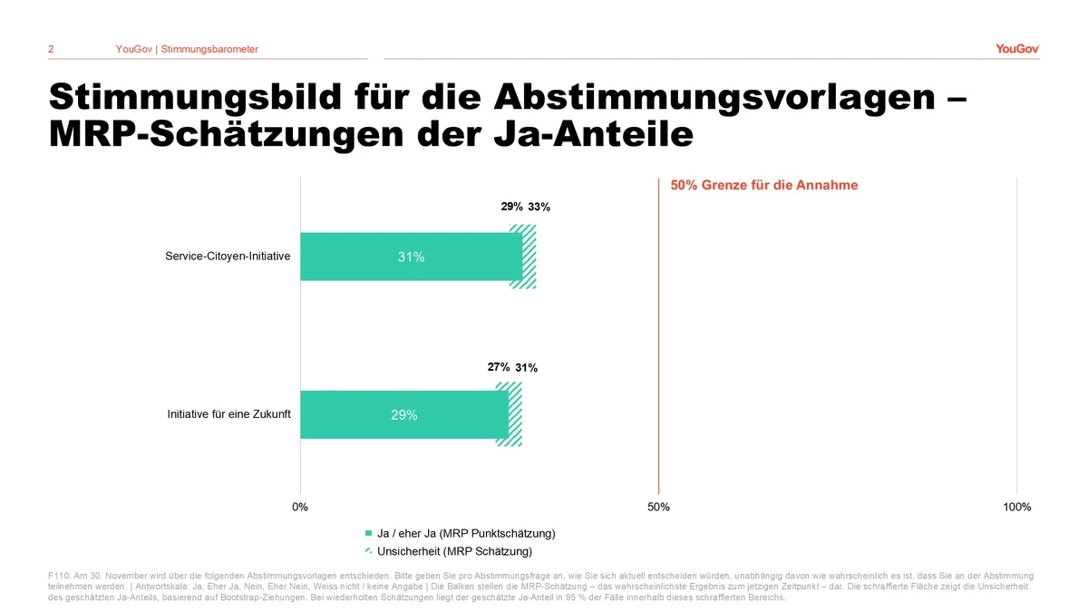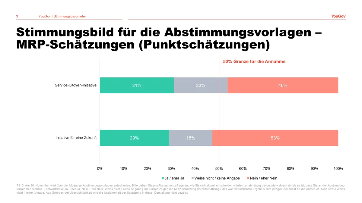 Zum aktuellen Zeitpunkt würden beide Initiativen die nötige Mehrheit zur Annahme deutlich verfehlen. Würden die Abstimmungen schon jetzt stattfinden, käme die Service-Citoyen-Initiative auf 31 Prozent Zustimmung und die Initiative für eine Zukunft auf einen Ja-Anteil von 29 Prozent.