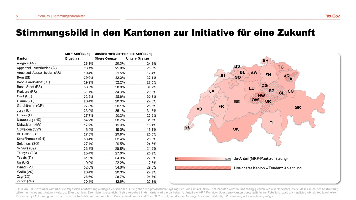 - Die Initiative für eine Zukunft findet die vergleichsweise grösste Zustimmung in Basel-Stadt und den Westschweizer Kantonen. Doch auch dort liegen die Ja-Anteile gegenwärtig deutlich unter der 50%-Grenze.