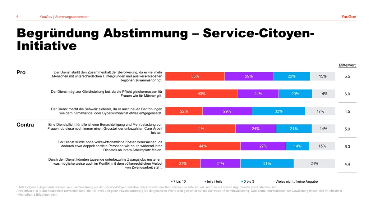 In der Diskussion um die Service-Citoyen-Initiative erhält das Argument, «der Dienst würde hohe volkswirtschaftliche Kosten verursachen» mit 44 Prozent die meiste Zustimmung (Werte zwischen 7 und 10). Auf die Frage, ob der Dienst zur Gleichstellung beiträgt, oder aber eine benachteiligende Mehrbelastung für Frauen ist, findet die Stimmbevölkerung keine eindeutige Antwort. 43 Prozent stimmen ersterem zu, 41 Prozent letzterem. Interessant ist in diesem Zusammenhang auch, dass mehr als ein Viertel (29%) derjenigen, die angegeben (eher) gegen die Initiative stimmen zu wollen, durchaus der Meinung sind, der Dienst trage zur Gleichstellung bei. Auf der anderen Seite stimmen auch 27 Prozent derjenigen, die (eher) mit Ja stimmen wollen dem Gegenargument zu, dass die Dienstpflicht Frauen aufgrund der Mehrbelastung benachteiligen würde. Das Thema der Geschlechtergerechtigkeit ist also eine zentrale Kontroverse im Zusammenhang mit dem «Service Citoyen». Ob man ihn eher als Schritt in Richtung Gleichstellung oder aber als Benachteiligung von Frauen wahrnimmt, ist jedoch nicht zwangsläufig mit einem Ja, respektive einem Nein, zur Initiative verbunden.