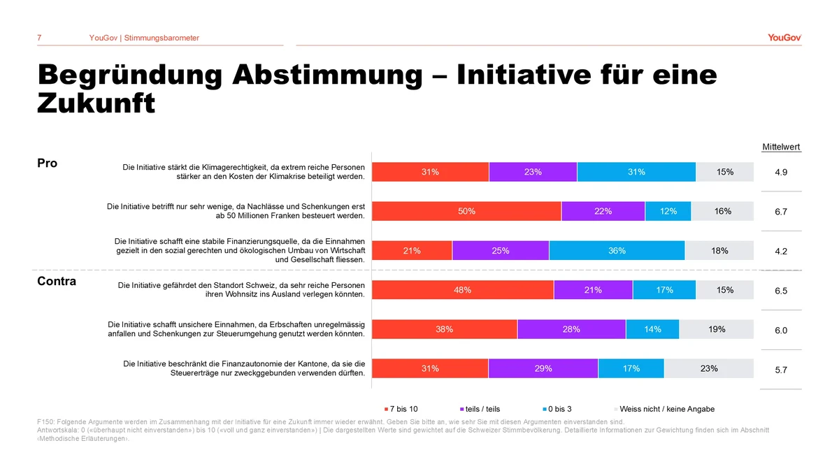 Bezüglich der Diskussion um die Initiative für eine Zukunft erhält die Aussage, sie betreffe «nur sehr wenige, da Nachlässe und Schenkungen erst ab 50 Millionen Franken besteuert werden» mit 50 Prozent den höchsten Zustimmungswert. Gleichzeitig ist dies jedoch weder ein eindeutiges pro- noch ein klares contra-Argument, da ihm sowohl 64 Prozent derjenigen, die angeben (eher) mit Ja stimmen zu wollen, als auch 50 Prozent derjenigen, die (eher) mit Nein stimmen möchten, zustimmen. Unter den Stimmbürgerinnen und Stimmbürgern, die die Initiative (eher) ablehnen möchten, erhält dagegen das ökonomische Argument, die Initiative gefährde den Standort Schweiz, mit 72 Prozent die meiste Zustimmung. Auch knapp 22 Prozent derjenigen, die (eher) mit Ja abstimmen wollen, stimmen diesem Argument zu. Für die Befürworterinnen und Befürworter der Initiative für eine Zukunft scheinen volkswirtschaftliche Bedenken jedoch nicht ausschlaggebend für ihre Abstimmungsentscheidung zu sein. Stattdessen stimmen 70 Prozent von ihnen dem Argument zu, «die Initiative stärkt die Klimagerechtigkeit, da extrem reiche Personen stärker an den Kosten der Klimakrise beteiligt werden».