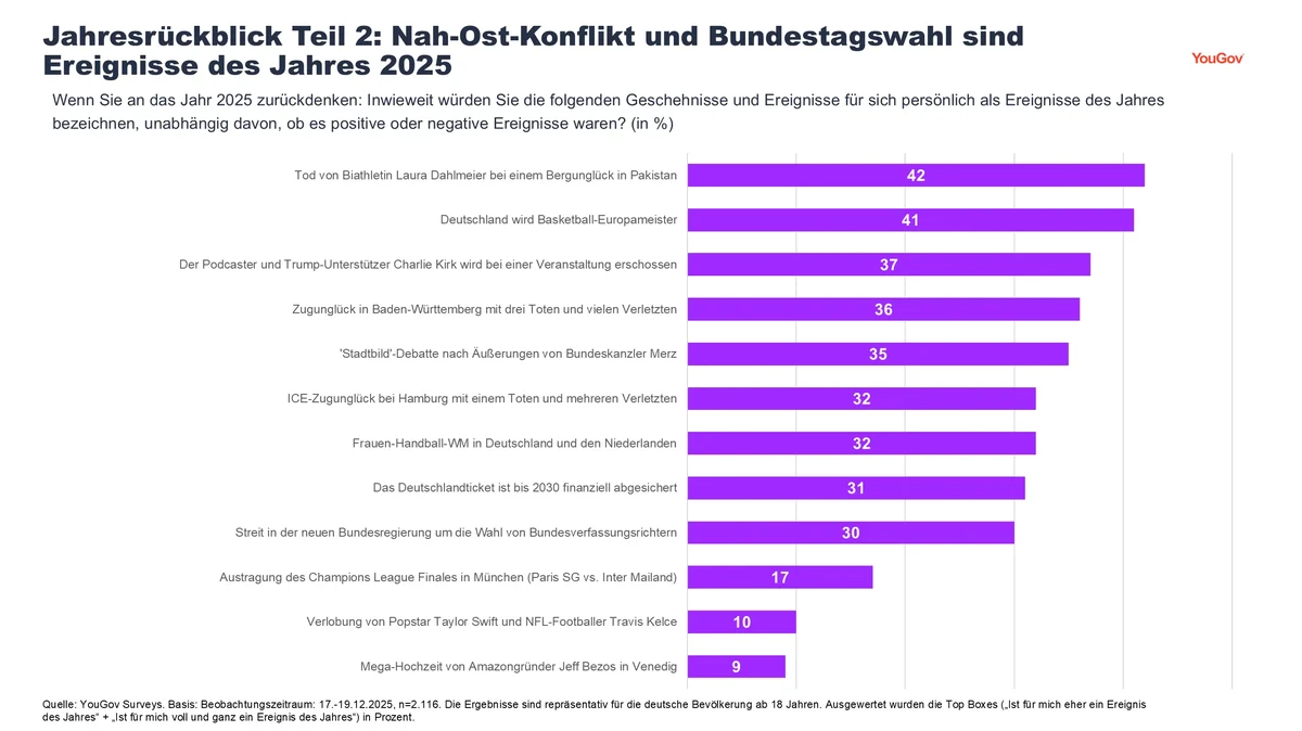 Für jeweils 48 Prozent zählen zudem das 35-jährige Jubiläum der Deutschen Einheit am 3. Oktober sowie der Tod von Papst Franziskus und die anschließende Wahl seines Nachfolgers Papst Leo XIV. im April und Mai zu den prägenden Ereignissen des Jahres 2025.