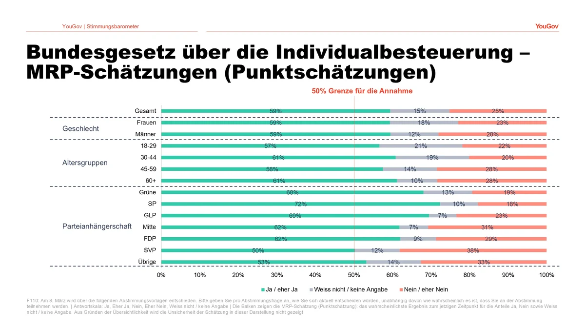 Aktuell deutet vieles auf eine Annahme der Vorlage hin: Laut der Modellschätzung sprechend sich 59 Prozent der Stimmbevölkerung dafür aus und selbst die untere Schätzgrenze von 57 Prozent liegt deutlich über der erforderlichen Mehrheit von 50 Prozent. Damit erscheint eine Zustimmung derzeit sehr wahrscheinlich. Interessant ist auch, dass die Individualbesteuerung breit abgestützt ist: Über viele verschiedene Bevölkerungsgruppen hinweg – unabhängig von Alter, Geschlecht oder politischer Präferenz – erreicht sie Zustimmungswerte von 50 Prozent oder mehr. Dabei steht die Abstimmungsabsicht von Anhängerinnen und Anhänger der Mitte und SVP mit 62 bzw. 50 Prozent Zustimmung zur Individualbesteuerung in deutlichem Widerspruch zu den Nein-Parolen der beiden Parteien.