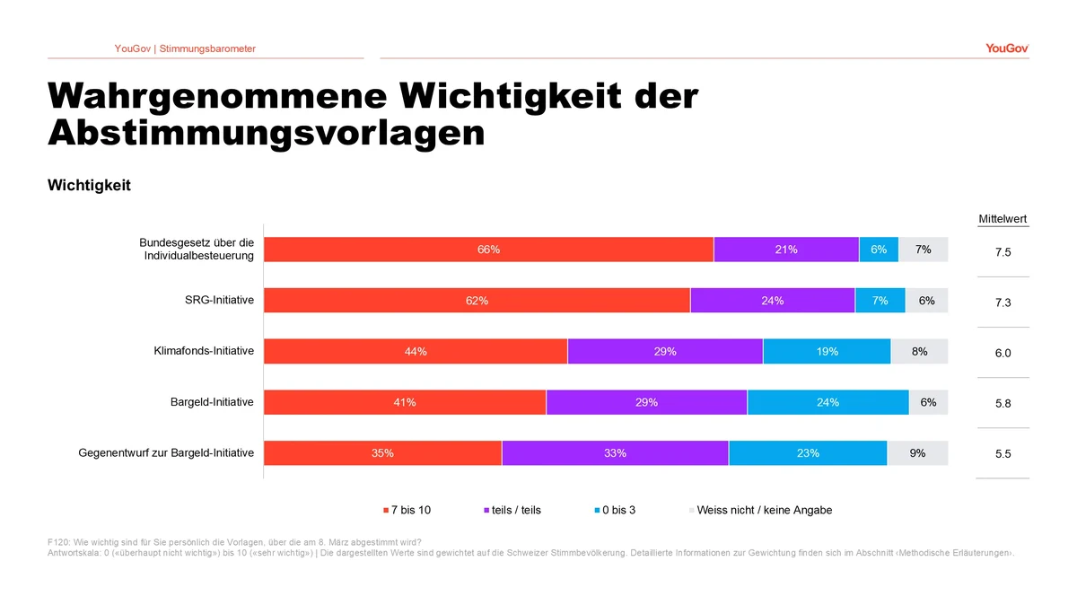 An erster Stelle steht die Individualbesteuerung: Zwei Drittel (66 Prozent) der Befragten stufen sie als sehr wichtig ein. Eine ähnlich hohe Relevanz schreibt die Bevölkerung der SRG-Initiative zu – 62 Prozent empfinden sie als sehr wichtig. Mit deutlichem Abstand, aber auf vergleichbarem Niveau, folgen die Klimafonds-Initiative mit 44 Prozent sowie die Bargeld-Initiative mit 41 Prozent, die somit beide von weniger als der Hälfte der Bevölkerung als sehr wichtig eingestuft werden.