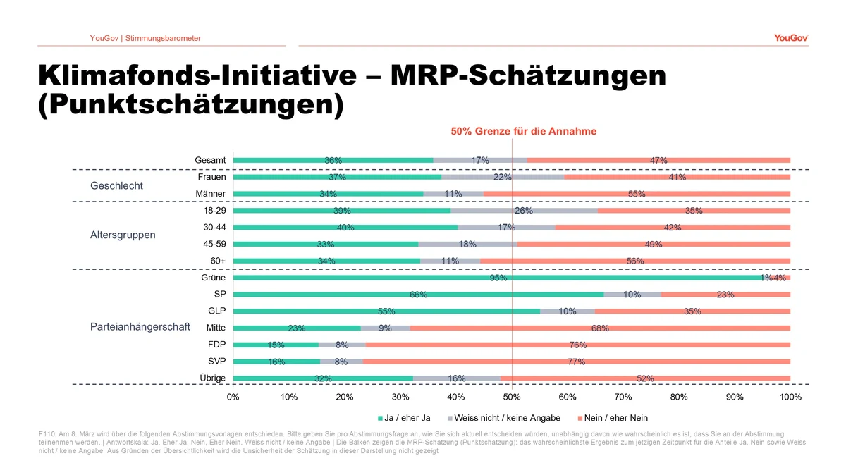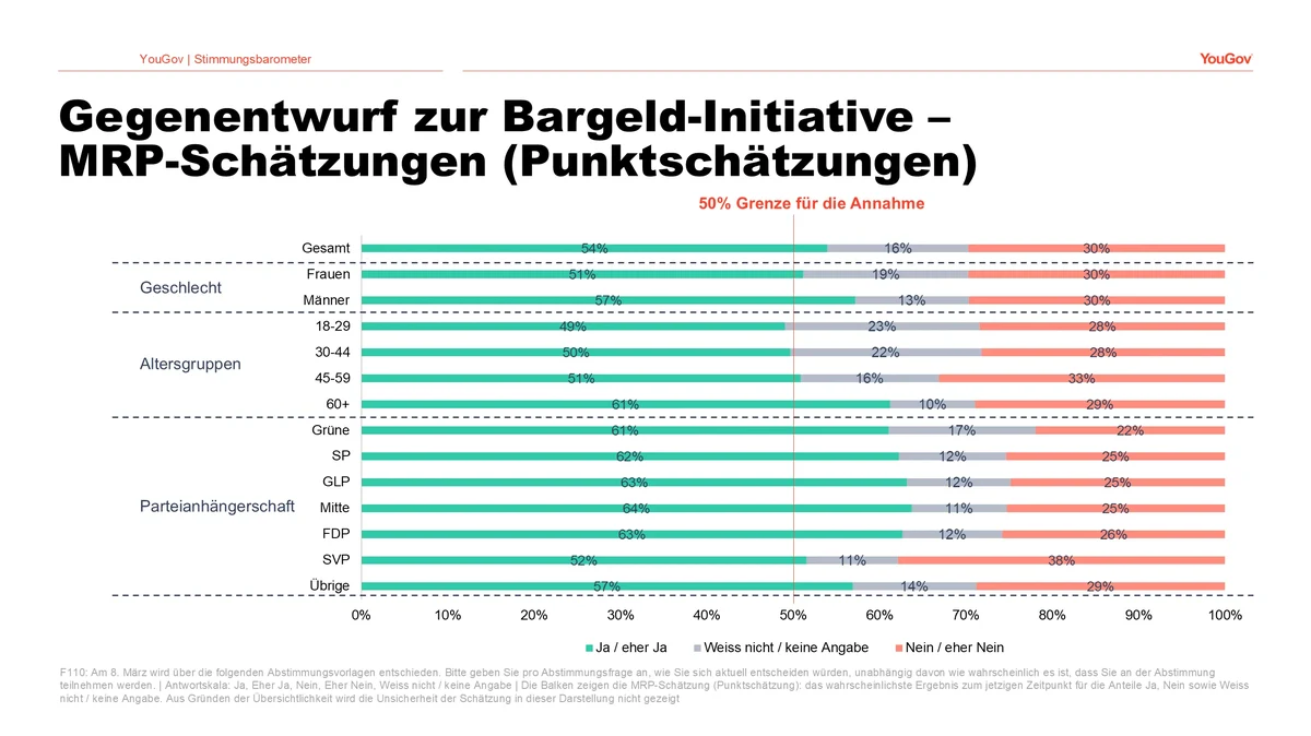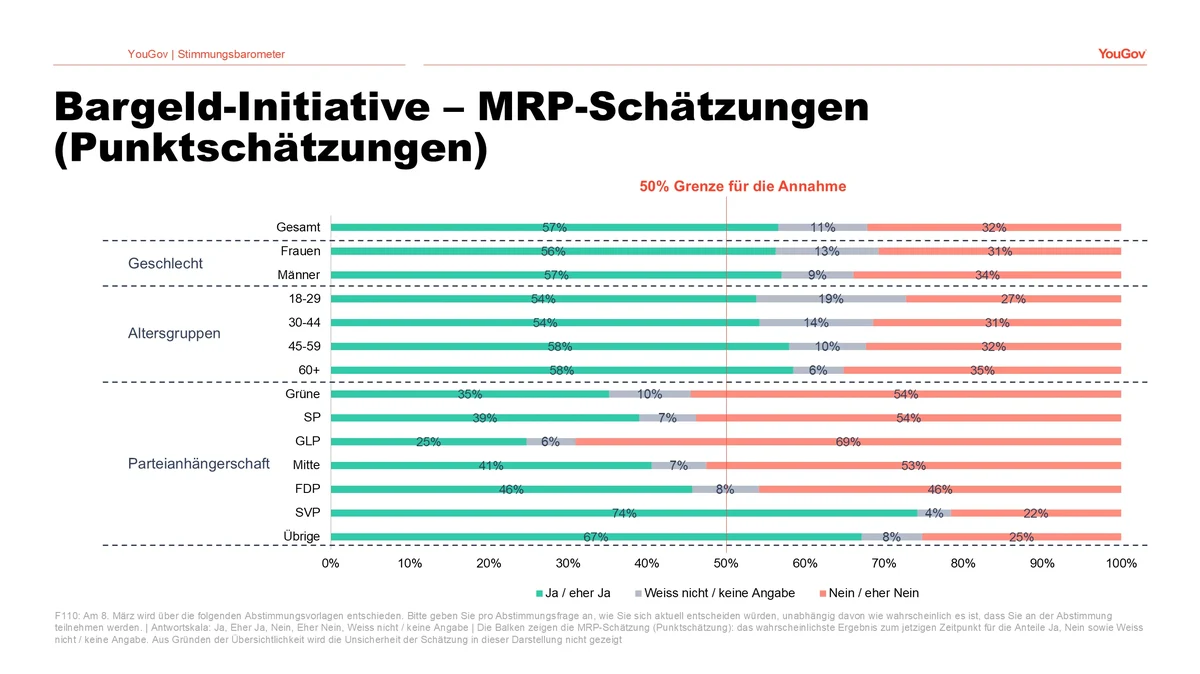 Die oben präsentierten Resultate basieren auf einer Umfrage, die die YouGov Schweiz AG (ehemals LINK Marketing Services AG) als Eigenstudie mittels Online-Interviews unter den Mitgliedern des unternehmenseigenen Schweizer YouGov Panels durchgeführt hat. Die Mitglieder des Panels sind aktiv rekrutiert und haben der Teilnahme an Online-Interviews zugestimmt. Für diese Befragung wurden im Zeitraum 13. bis 26. Januar 2026 insgesamt 3’380 Personen in einer repräsentativen Stichprobe, quotiert nach Alter, Geschlecht und Sprachregion, befragt. Die Stichprobe bildet die Grundgesamtheit der stimmberechtigten Bevölkerung der Schweiz ab 18 Jahren hinsichtlich dieser Quotenmerkmale ab. Die präsentierten Werte der aktuellen Abstimmungsabsicht wurden mittels MRP-Modellierung berechnet, alle anderen abgebildeten Daten sind gewichtete Werte. Die Gewichtung basiert auf den Variablen Alter, Geschlecht, Sprachregion, Erwerbstätigkeit und Haushaltsgrösse. Bei einer fünfprozentigen Irrtumswahrscheinlichkeit liegt der Stichprobenfehler bei ±1.69 Prozent.