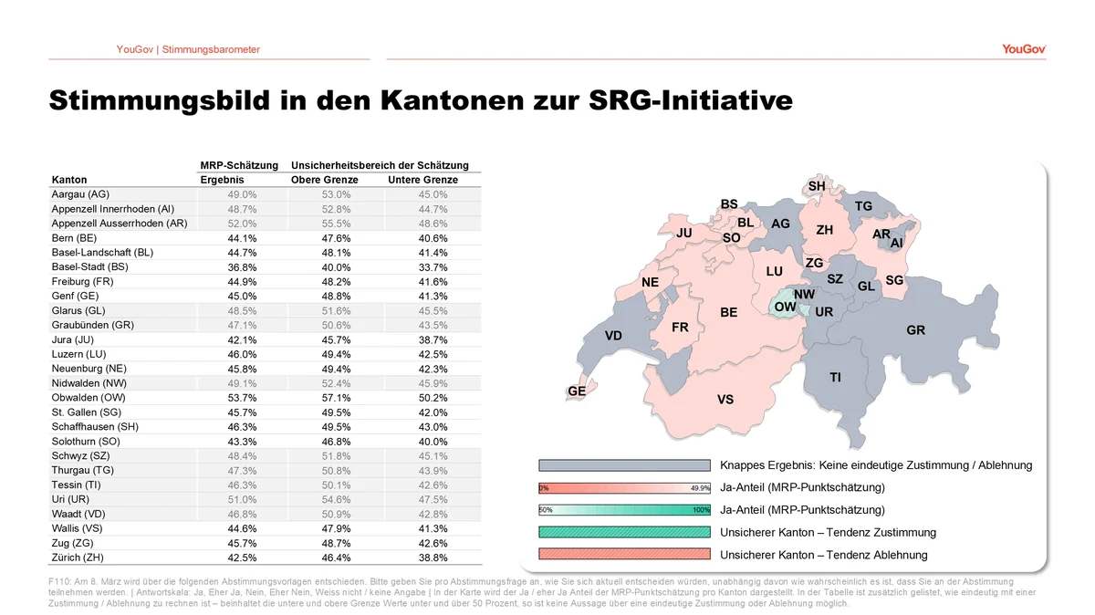 Ganz anders sieht die aktuelle Stimmung in den Kantonen hinsichtlich der SRG-Initiative aus. Für diese Initiative bestünde zum jetzigen Zeitpunkt in keinem Kanton mit sicherer Schätzbasis eine eindeutige Mehrheit. Würde heute schon abgestimmt, würde stattdessen in einer Mehrheit der Kantone der Ja-Anteil eindeutig unter der 50%-Marke liegen.