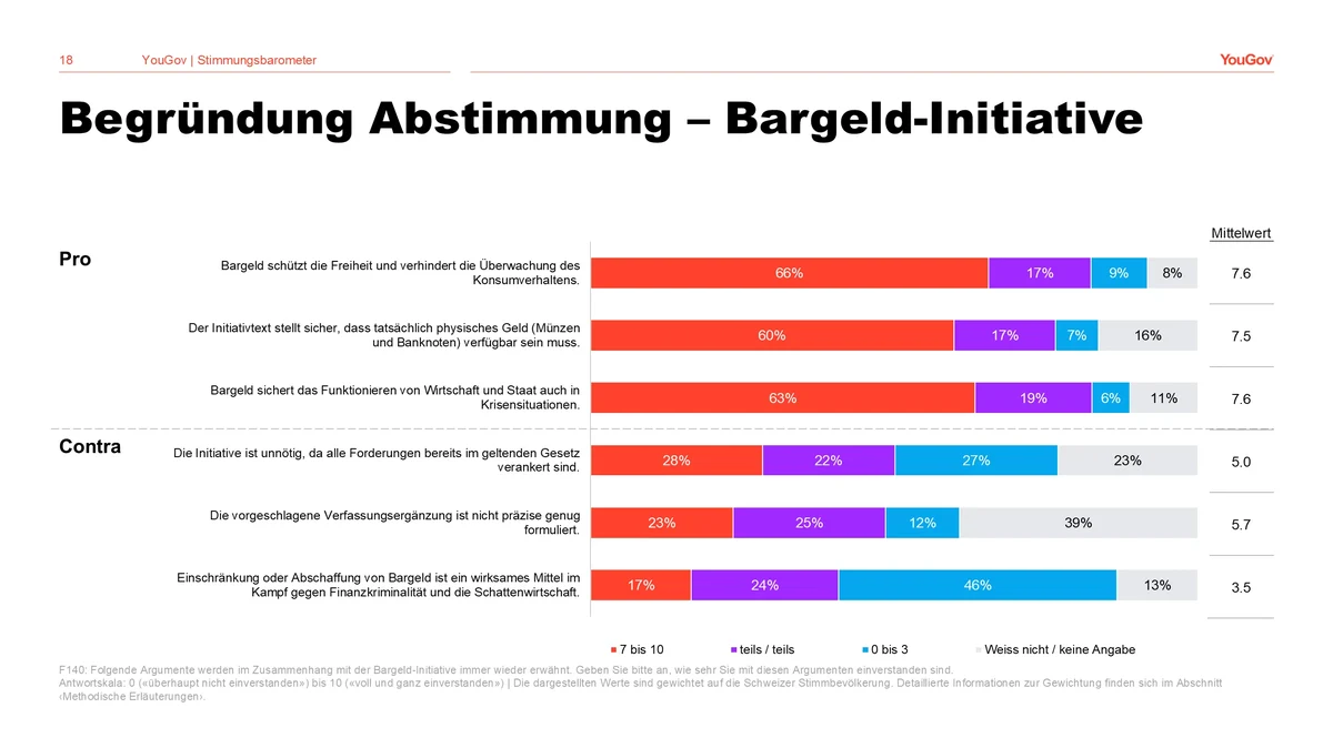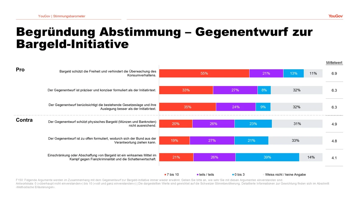 Sowohl im Zusammenhang mit der Bargeld-Initiative als auch mit dem Gegenvorschlag stellt für die Befragten die Aussage «Bargeld schützt die Freiheit und verhindert die Überwachung des Konsumverhaltens» das überzeugendste Argument dar. Nur eine Minderheit (23 Prozent) stimmt hingegen zu, dass die vorgeschlagene Verfassungsergänzung der Bargeld-Initiative nicht präzise genug formuliert sei.