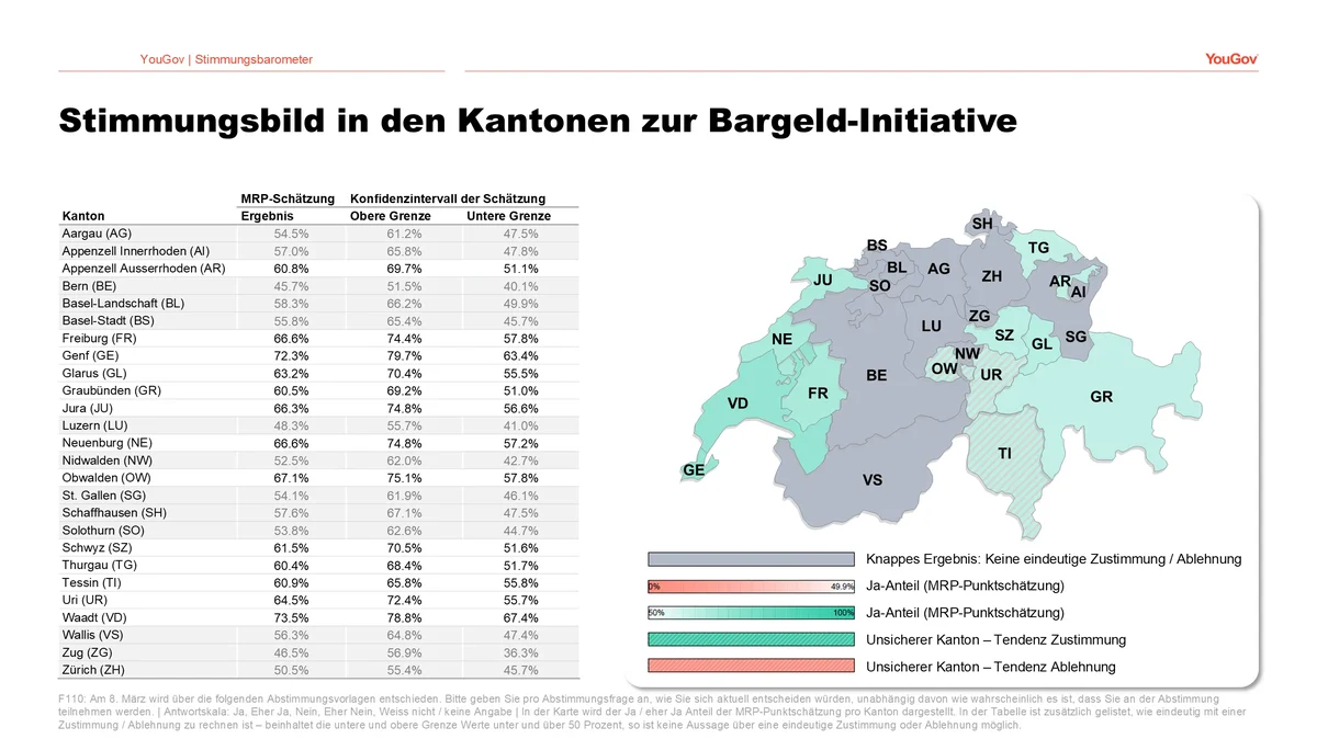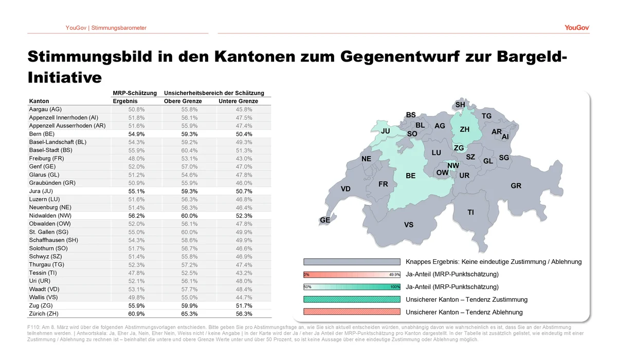 Auch für die Bargeld-Initiative finden sich besonders hohe Zustimmungsraten in der Westschweiz, während in den meisten deutschsprachigen Kantonen der Ausgang der Abstimmung aktuell nicht eindeutig wäre. Noch offener ist die Situation in den Kantonen hinsichtlich des Gegenvorschlags. Hier lässt sich zum aktuellen Zeitpunkt in fast allen Kantonen nicht eindeutig bestimmen, ob der Ja-Anteil über oder unter der 50%-Grenze läge, wenn heute bereits abgestimmt würde.
