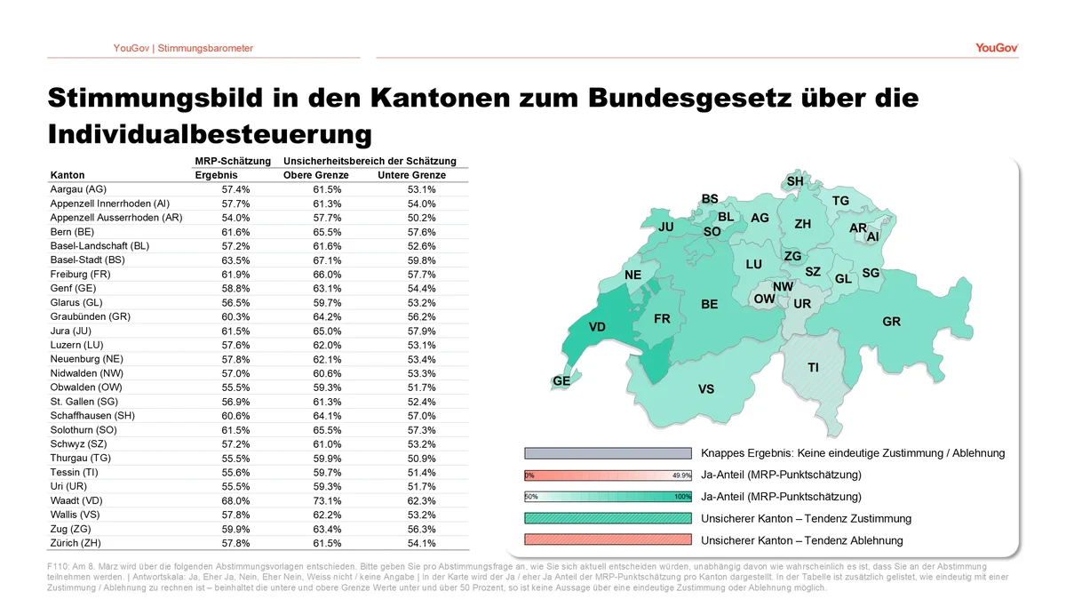 Mithilfe unseres MRP-Modells können wir auch auf kantonaler Ebene schätzen, wie die Abstimmungen aktuell ausgehen würden. Dabei werden kantonale Charakteristiken berücksichtigt, gleichzeitig jedoch die Gesamtheit der Befragungsdaten genutzt, um die momentanen Abstimmungsabsichten in allen Kantonen zu schätzen. So können wir auch für Kantone mit geringer Bevölkerungsgrösse Ergebnisse ausweisen.