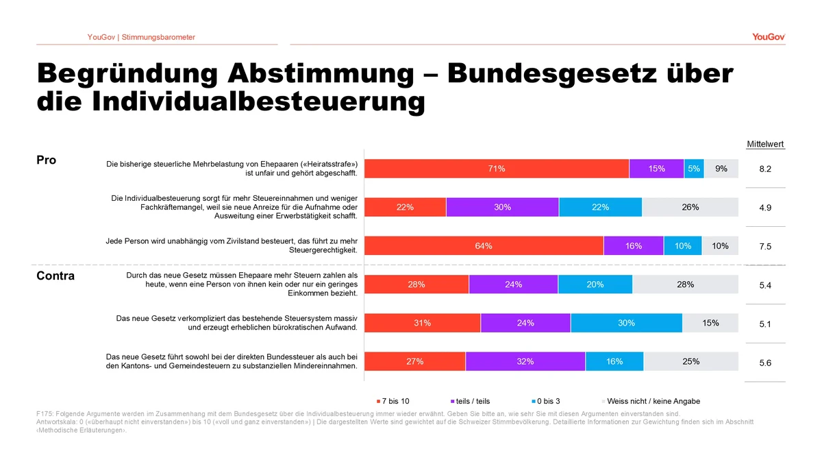 In der Diskussion um die Individualbesteuerung ist das eindeutig stärkste Argument die wahrgenommene Unfairness der sogenannten «Heiratsstrafe». 71 Prozent stimmen der Aussage «Die bisherige steuerliche Mehrbelastung von Ehepaaren («Heiratsstrafe») ist unfair und gehört abgeschafft» zu. Das Contra-Argument mit der höchsten Zustimmung betrifft die bürokratischen Folgen. 31 Prozent stimmen der Aussage zu, das neue Gesetz verkompliziere das bestehende Steuersystem massiv und erzeuge erheblichen bürokratischen Aufwand.