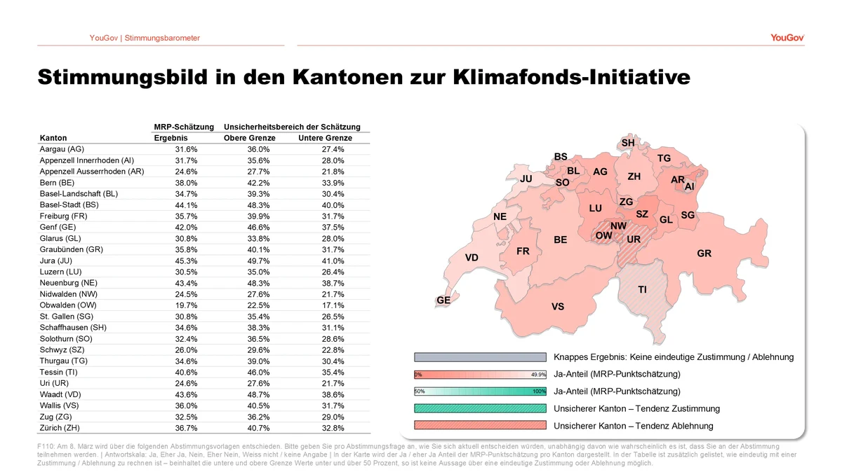 Im Falle der Klimafonds-Initiative zeigt sich wiederum ein eindeutiges kantonales Stimmungsbild. Die höchste Zustimmung erhält die Initiative aktuell in der Westschweiz sowie im Kanton Basel-Stadt. Allerdings liegen auch bei Berücksichtigung der statistischen Unsicherheit der Schätzungen die Werte in jedem Kanton klar unter der 50%-Grenze.