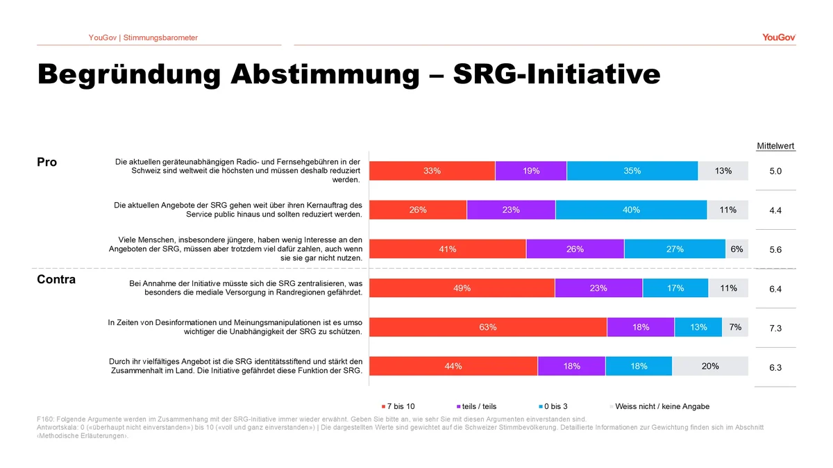 Im Zusammenhang mit der SRG-Initiative erhalten die Gegenargumente mehr Zustimmung als die Pro-Argumente. Knapp zwei Drittel (63 Prozent) der Befragten sind der Meinung, dass es in Zeiten von Desinformation und Meinungsmanipulation umso wichtiger sei, die Unabhängigkeit der SRG zu schützen. Auch die Aussagen, die Initiative gefährde die mediale Versorgung der Randregionen und die identitätsstiftende Funktion der SRG erhalten Zustimmung von 49 respektive 44 Prozent der Befragten. Das Pro-Argument mit der höchsten Zustimmung (41 Prozent) ist die Aussage «Viele Menschen, insbesondere jüngere, haben wenig Interesse an den Angeboten der SRG, müssen aber trotzdem viel dafür zahlen, auch wenn sie sie gar nicht nutzen». Dahingegen ist nur etwa ein Viertel (26 Prozent) der Meinung, dass das aktuelle Angebot der SRG weit über ihren Kernauftrag des Service public hinausginge.