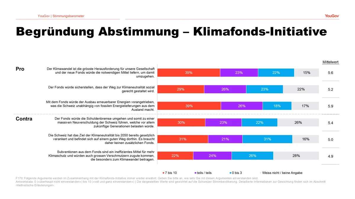 Trotz der überwiegenden Ablehnung der Klimafonds-Initiative sind die beiden Argumente mit den höchsten Zustimmungswerte Pro-Argumente. Jeweils 39 Prozent der Befragten stimmen den Aussagen zu, der Fonds treibe den Ausbau der erneuerbaren Energien voran, was die Schweiz unabhängiger von Energielieferungen aus dem Ausland mache und der Fonds würde die nötigen Mittel liefern, um mit dem Klimawandel, der grössten Herausforderung für unsere Gesellschaft, umzugehen.