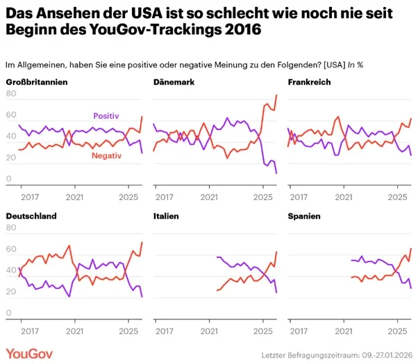 Während Donald Trump inzwischen offenbar eine weitgehend symbolische Lösung im Grönland-Konflikt zu akzeptieren scheint, haben die Androhungen einer möglichen amerikanischen Militäroperation zur Einnahme der Insel die transatlantischen Beziehungen tief erschüttert. Neue Trackingdaten aus der internationalen YouGov-Politikbefragung in Dänemark, Deutschland, Frankreich, Großbritannien, Italien und Spanien vom 9. bis 27. Januar 2026, zeigen: Das Ansehen der USA hat sich infolge der Grönland-Krise weiter verschlechtert – in fünf dieser Länder ist es so negativ wie nie seit Beginn der Erhebungen 2016.