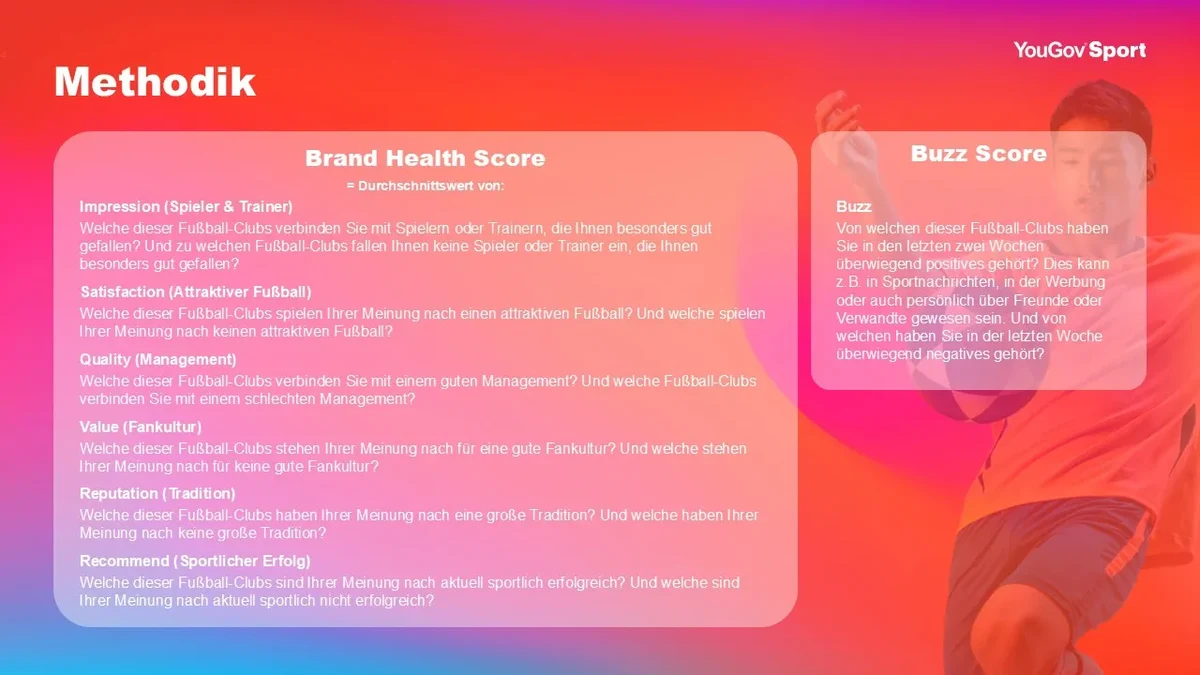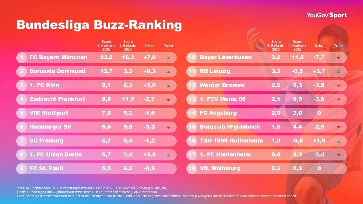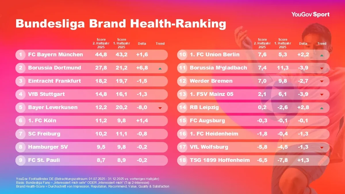 Beobachtungszeitraum der Analyse ist 1. Juli bis 31. Dezember 2025, also die ersten 15 Spieltage der Saison 2025/26, im Vergleich zum ersten Halbjahr 2025. Befragt wurden Personen, die sich (stark) für die Bundesliga interessieren (Top 2-Interesse). Der FootballIndex erfasst kontinuierlich, wie Fans und Öffentlichkeit Clubs anhand von 16 verschiedenen KPIs bewerten. So lässt sich ein differenziertes Bild von Markenstärke, Wahrnehmung und Medienresonanz gewinnen.