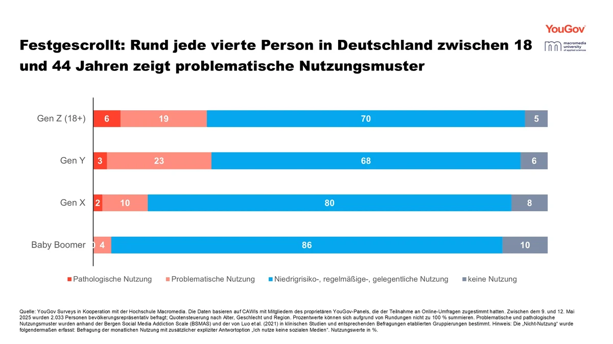 Bereits im Frühjahr hatte eine gemeinsame Erhebung von YouGov und der Macromedia University of Applied Sciences gezeigt, dass rund 15 Prozent der Deutschen typische Anzeichen von Social-Media-Sucht zeigen. Ein neuer Blick auf Nutzungsmuster und Online-Verhalten zeigt, wo und für wen Social-Media riskant wird – Erkenntnisse, die als Grundlage für politische Maßnahmen dienen sollten.